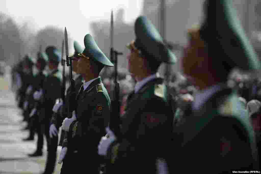 Мамлекет башчысы Алмазбек Атамбаев, экс-президент Роза Отунбаева, парламент төрагасы Асылбек Жээнбеков жана өкмөт башчысы Жантөрө Сатыбалдиев аскердик кароолдун коштоосунда “Эркиндик” эстелигине гүлчамбар коюшту.