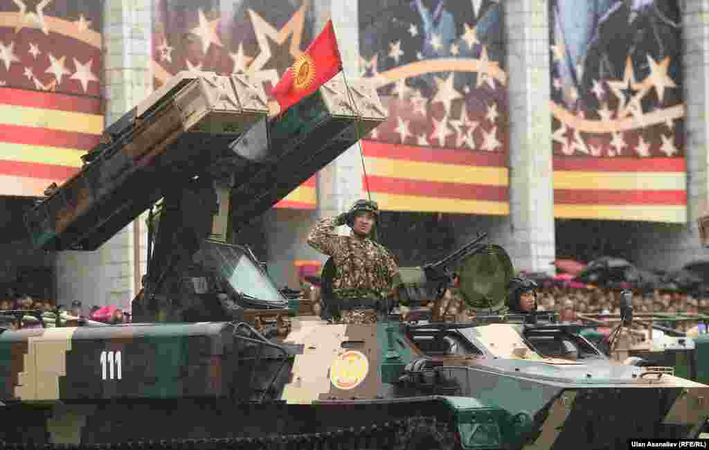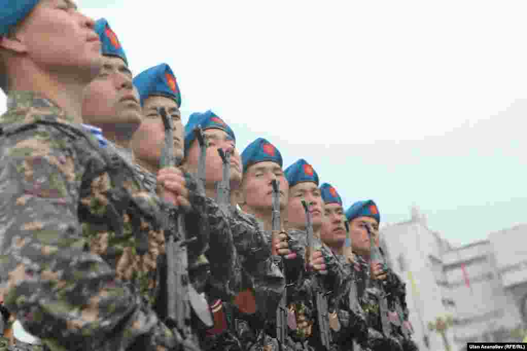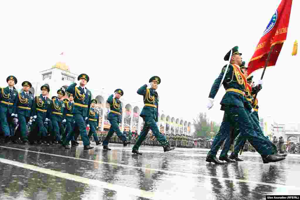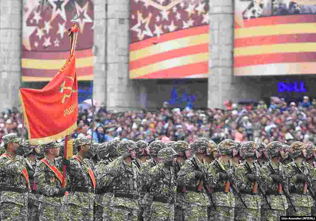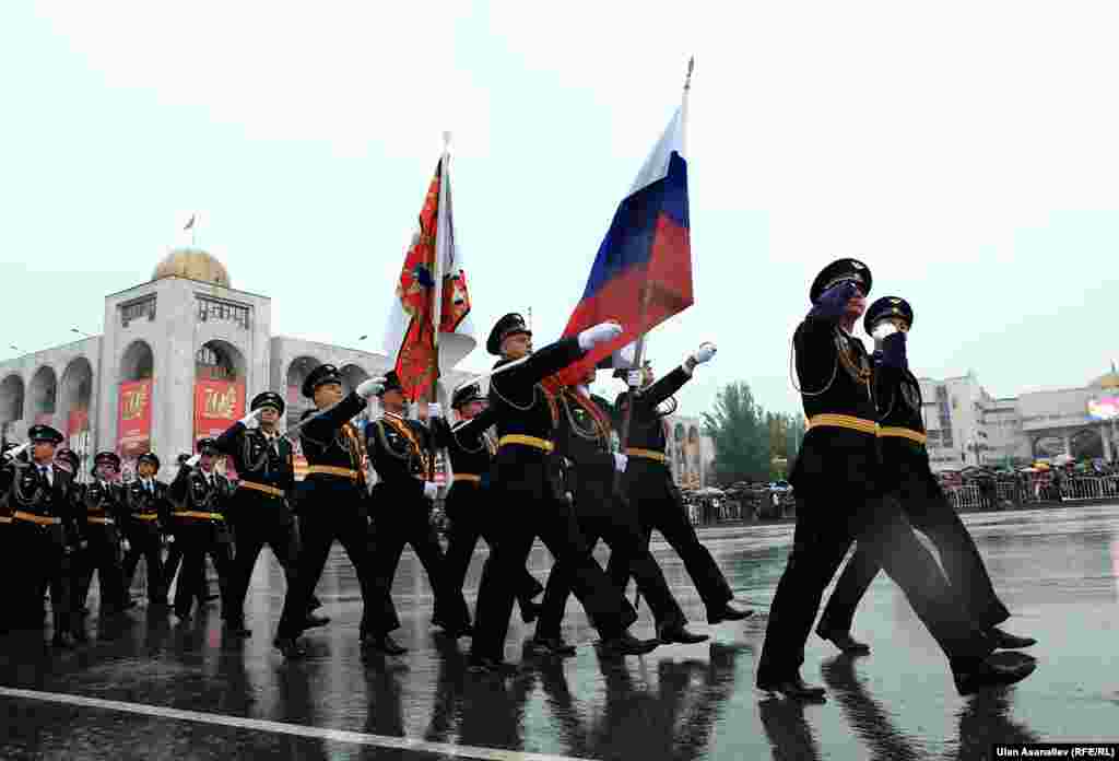 Бишкектеги парадга аскердик бөлүктөрдүн жоокерлери чыгып, аскердик техника өттү. Бул жылы биринчи жолу парадга Канттагы Орусиянын аскердик базасынын учактары катышты.