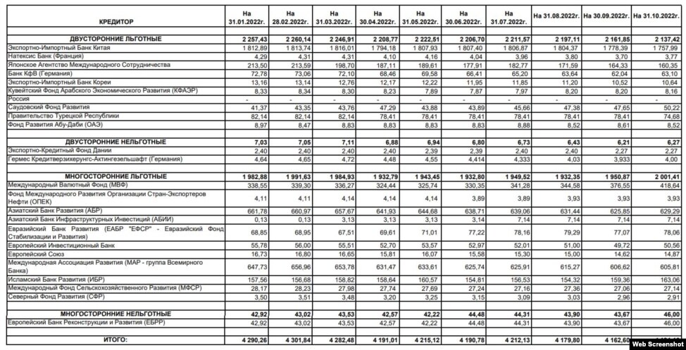 2022-жылдын ноябрь айына карай Кыргызстандын тышкы карызы. Маалымат Финансы министрлигинин сайтынан алынды.