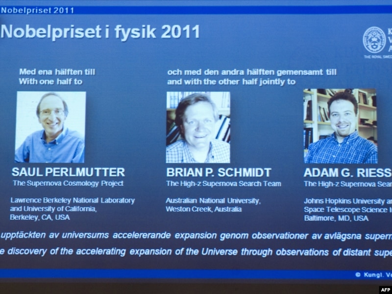 Сол Перлмуттер Калифорниядагы Бөркли университетинин, Адам Райсс Балтимордогу Жон Хопкинс унивеситетинин профессорлору. Ал эми профессор Брайан Шмидт Австралия улуттук университетинде эмгектенет. Бул үч физик 1998-жылы аалам тездик менен кеңейип жатканын жаңы пайда болгон жылдыздарды изилдеп жатып табышкан.